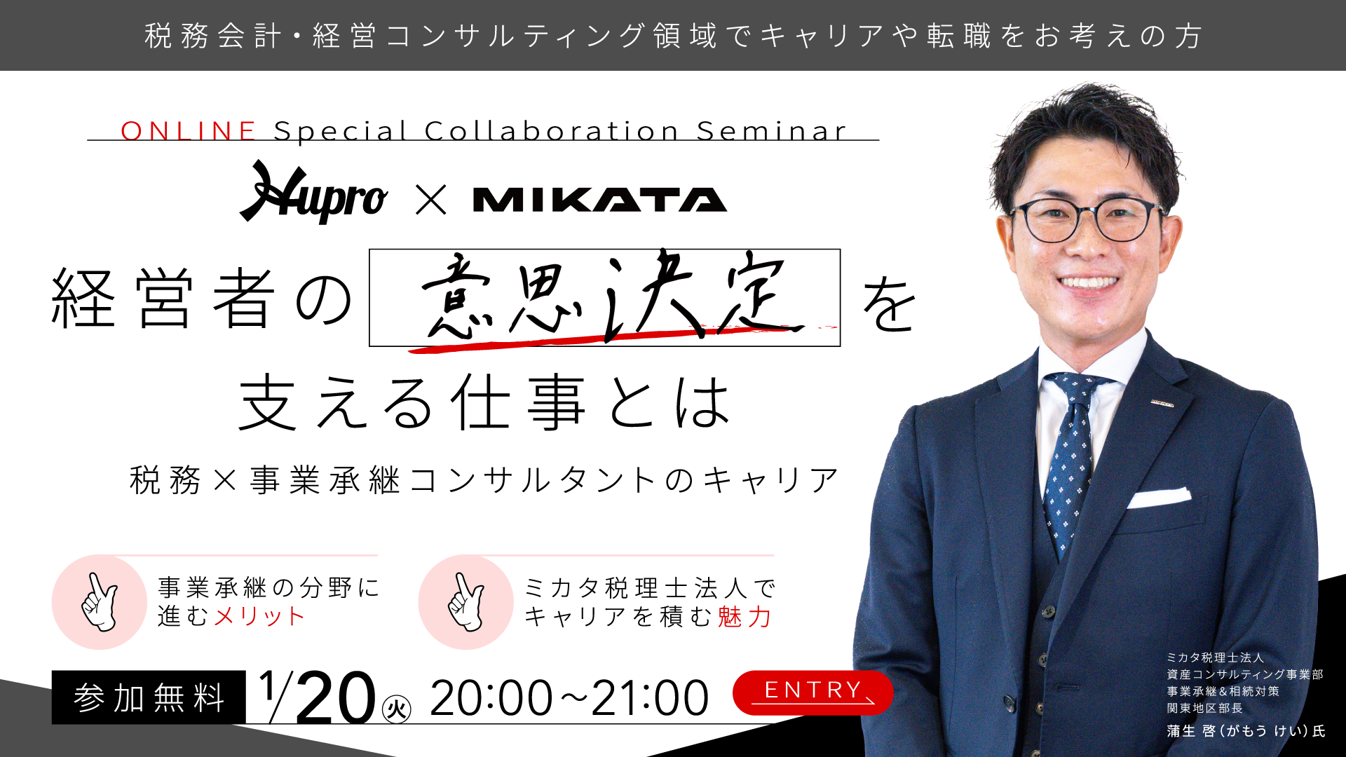 本セミナーでは、税務と事業承継に精通したミカタ税理士法人のコンサルタントが登壇し、「経営者の意思決定を支える仕事とは」をテーマに税務の知識を駆使して経営者の決断を支えるプロフェッショナルの実務について徹底解説いたします。
