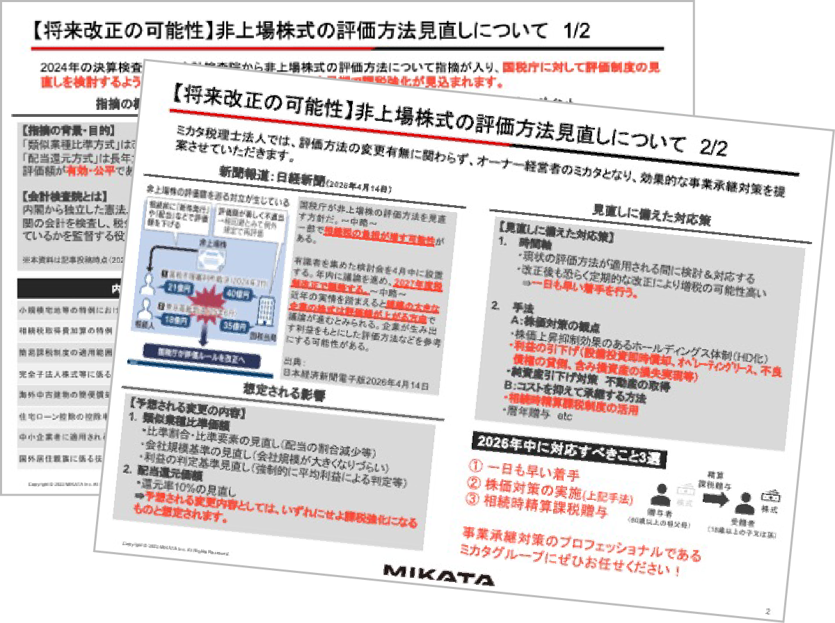 現在、非上場株は「財産評価基本通達」により評価されていますが、評価方式の違いで評価額に最大4倍の差が出るなど、公平性の確保が課題となっていました。これを受け、ミカタ税理士法人の専門チームでは最新の動向をまとめた解説資料を作成いたしました。